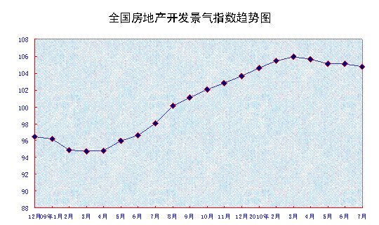 中新網(wǎng)8月10日電 據(jù)國(guó)家統(tǒng)計(jì)局網(wǎng)站消息,7月份,全國(guó)房地產(chǎn)開(kāi)發(fā)景氣指數(shù)(簡(jiǎn)稱(chēng)“國(guó)房景氣指數(shù)”)為104.72,比6月份回落0.34點(diǎn),比去年同期提高6.71點(diǎn)。