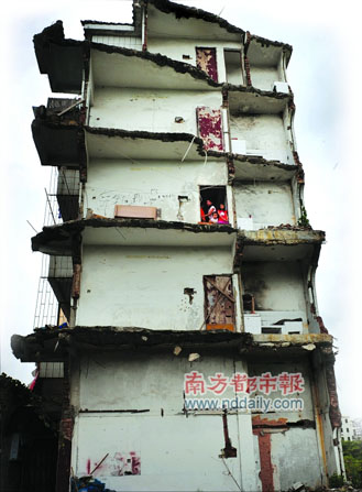 在香洲紅山村內矗立著一幢很“特別”的四層樓房,一半被完全拆除,一半卻住滿居民。據屋主稱,該樓房屬兩家合建,去年該樓面臨改建,其中一家與開發商達成補償同意拆除,而他們所住的這一方未能談妥,導致出現“半邊樓”。至此,他們已經在這里住了一年多了。記者獲悉該開發商因故停止運作,改造項目尚無時間表。