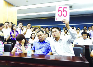 55號舉牌的是一位戴著眼鏡的年輕男士,只要聽到主持人報出一個號碼,就立刻舉牌,基本不與身邊坐著的人談話,志在必得;他身邊的中年男士保持微笑,中年女士則神色凝重低頭看手機。坐在最后一排的1號單位代表是一位頭發花白、約50歲開外的男士,他甚至看也不看一眼坐在前方的1號,緊緊地盯著臺上的主持人,只要主持人報出價格,立刻將手中的號碼牌舉過頭頂,動作干脆利索。