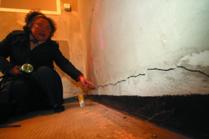 從2004年11月開始,姜女士家的房子就一直在修,房子開始只是出現了滲水問題,在第一次維修后不到一周,又出現滲漏,在短短4個月內,陽臺、墻體、門廳天棚、窗戶先后滲水,一樓廚房地面等地方有多條裂縫,直至2005年3月,一共修了五回。“基本上沒有停過,而開發商面對滲漏和裂縫,就簡單地用石灰水覆蓋。”維修之后,姜女士去查看,裂縫果然不見了,但過不了多久,裂縫再次出現并且越來越多,變深也變長了。記者在現場也能看到不少裂縫上有涂過石灰水的痕跡。