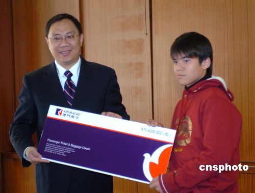 一月二日,澳門航空運營總裁陳新先生(左)在總部為澳門航空與澳門電訊聯合在澳門-大阪航線上舉辦的一項推廣活動獲獎者頒獎。中新社發 史利 攝