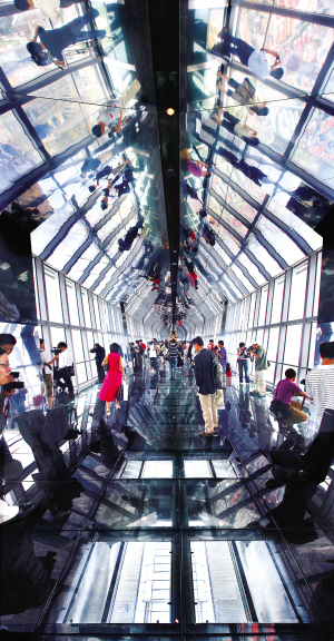 再轉乘專用電梯,終于來到位于100層、距地面474米處的“觀光天閣100”。這是目前世界最高的觀光設施。55米長的懸空觀光長廊,其實就是大廈頂部倒梯形風洞的上檐,三角形屋頂鑲滿玻璃鏡面,光影折射夢幻迷離。長廊地面鋪有3條透明玻璃地板,可直接俯瞰腳底下陸家嘴金融貿易區川流不息的車流、芳草如茵的綠地及連綿的樓宇,對膽量是一種小小的考驗呢!難怪在轉乘電梯時,顯示屏播放的內容為:玻璃地板的安全性能。