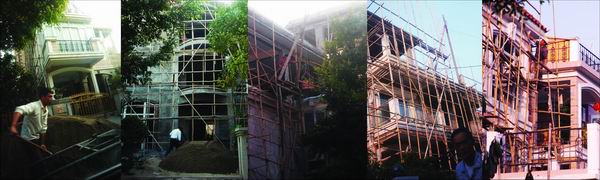 來到小區(qū)內(nèi)雅濤二街,一座原兩層半的別墅四周全是腳手架,樓下堆滿水泥沙石。不斷有泥頭車轟隆轟隆地開過來,將一堆水泥傾倒地上,空氣中滿是灰塵。房屋的大門已經(jīng)撤下,幾個(gè)滿頭大汗的工人站在腳手架上忙碌,幾個(gè)月的工夫,他們將房屋砌到了5層樓高。