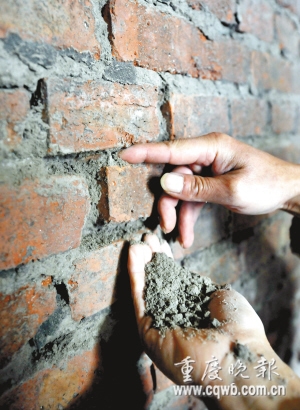 昨日,記者見到這份鑒定書,內容表明,這幢樓去年3月16日完工,當年6月18日交業主使用。檢查發現,“頂樓到3層房屋墻體、門窗過梁、樓梯間嚴重開裂,3層以上開裂4~5公分……至目前,房屋質量問題嚴重加大,經檢查墻體灰口、粉刷砂漿標號十分低劣,未按設計要求施工。底樓大梁已斷裂。”