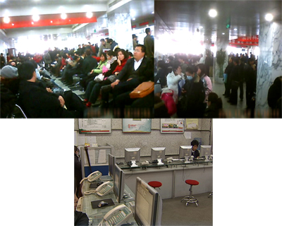 為了了解過戶的實際情況,記者采用了隱蔽拍攝的方式。在朝陽區房產交易中心記者看到,整個大廳到處都是排隊等待過戶和辦證的購房者。幾排座椅已經坐滿了人,過道上和各個窗口都擠滿了人。有的人從早上5點就起來排號,在長時間的等待中,甚至都睡著了。由于怕錯過號,有的人到了吃飯時就隨便買點盒飯打發,記者了解到,最近幾周來,這里都是人山人海。