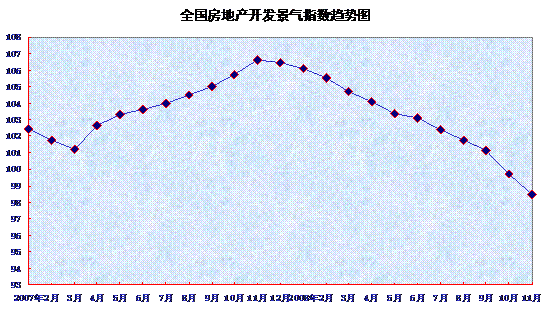 中新網(wǎng)12月12日電 中國信息報今天刊出了國家統(tǒng)計局月度形勢報告《2008年1-11月全國房地產(chǎn)市場運(yùn)行情況》。月度報告指出,11月份,全國房地產(chǎn)開發(fā)景氣指數(shù)(簡稱“國房景氣指數(shù)”)為98.46,比10月份回落1.22點(diǎn),比去年同期回落8.13點(diǎn)。