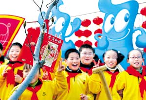 在白玉蘭樹上掛一張張心愿卡,小朋友要伴隨世博會一起快樂成長本報記者 陳正寶 攝
