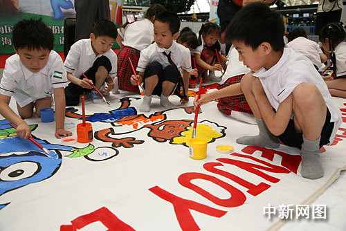 孩子們在世博主題表演中拉開了活動序幕。隨后,來自五洲四海、有著不同的膚色和語言的孩子們在10米長卷上現場繪畫,他們用靈巧的雙手畫出了世博吉祥物海寶、東方明珠、浦東機場等上海標志性建筑,用豐富的想象勾勒出心中理想的城市,用自己的小手做畫筆印在畫布上,形象、天真地詮釋了“城市,讓生活更美好”的世博主題,表達了對2010年上海世博會的期待和向往。
