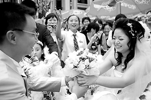 儀式中,上海世博會(huì)志愿者服務(wù)站破例來校為新人們現(xiàn)場(chǎng)登記,8位新人婚禮當(dāng)天完成一樁心愿———光榮加入上海世博會(huì)志愿者隊(duì)伍。(彭薇 陳煥聯(lián))