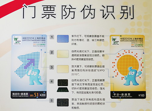 為了讓民眾放心購買,上海世博會門票在防偽方面下足功夫。購票者可通過眼看、手摸、借助紫外燈以及放大鏡等方式判斷門票真?zhèn)巍!吧虾J啦⿻T票采用了具有自主知識產(chǎn)權的芯片技術,其最顯著的特點就是將傳統(tǒng)印刷防偽技術與電子芯片技術進行創(chuàng)新結合,具有防偽性能強、獨占性高、唯一性好、時效性長、確保安全可靠等特點。”陳先進介紹說。同時,他表示,有關部門將嚴厲打擊非法銷售世博會門票的行為,以保護廣大購票者利益。 (徐筍)