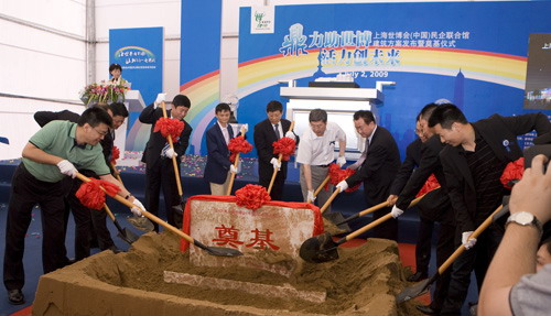 奠基儀式上,阿里巴巴董事局主席馬云代表民企館組委會與上海世博局局長洪浩互贈禮物。雙方分別贈送的是象征中國精神的上海世博會中國館模型和寓意中國民企“鼎力助世博 活力創未來”的琉璃鼎。