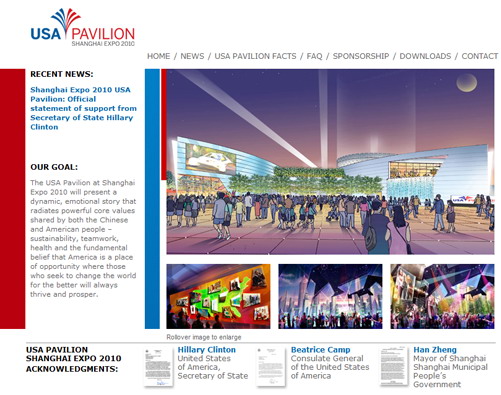 通過“最新動態”,網友可以清晰、直觀地了解美國館每一步的籌備動態;而在“美國館概況”欄目中,網站全面介紹了美國館的理念、組織方及參展目標等。此外,該網站還特別刊登了美國國務卿希拉里•克林頓等簽發的關于美國參與2010年上海世博會的信函。