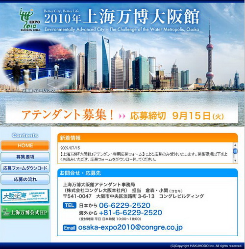 7月17日,記者從2010年上海世博會日本大阪城市最佳實踐區(qū)案例工作人員招聘網(wǎng)站上獲悉,世博會日本大阪城市最佳實踐區(qū)案例開始招聘工作人員,計劃招聘約15名,工作崗位包括日常接待、講解、導游、VIP接待、活動宣傳等。受聘者將作為康格會展(上海)有限公司的員工被雇用,工作期限為2010年4月1日至10月31日。