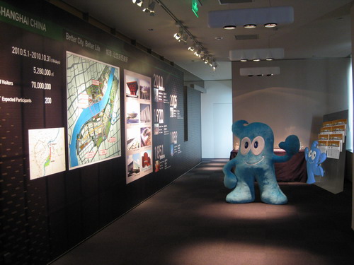 在新設的“中國2010年上海世博會宣傳和展示專區”里,海寶微笑著迎接參觀者。來環球金融中心的市民可以通過圖片介紹了解世博會,同時還可隨時取閱設在專區內海寶資料架上的世博宣傳品。