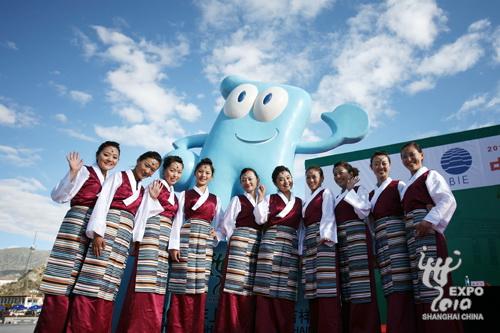 在雄偉壯觀的布達(dá)拉宮前,上海世博會(huì)的使者“海寶”張開笑臉,歡迎來自四方的游客,開幕活動(dòng)儀式結(jié)束后,廣場上的民眾爭相與“海寶”留影紀(jì)念,他們紛紛表示希望2010年去上海看世博會(huì)。
