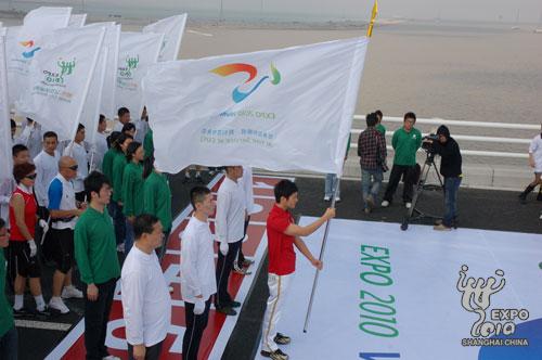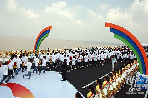 共青團上海市委書記、上海市世博會籌備工作領導小組志愿者組副組長潘敏為“大橋跑”發令起跑。起跑前,21名少女手捧取自沿長江21個城市采集而來的母親河水水樣,匯入長江入海口,表達了志愿者的拳拳赤子之心,也表達了志愿者對上海世博會的美好祝愿。