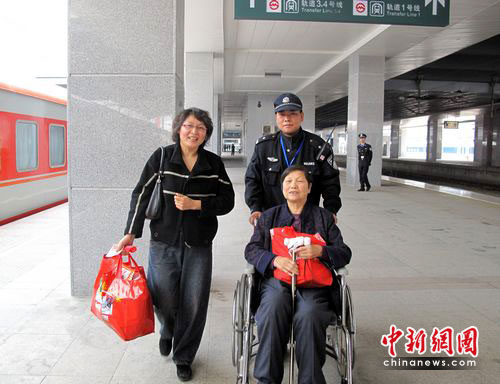 中新網(wǎng)徐州4月24日電 (耿晴 張良燦 侯啟光)“您好,我是上海鐵路民警,請問要到哪去?輪椅我來幫您推! ”在上海火車站6號候車室,來自徐州鐵路公安處援滬安保民警邊詢問邊接過一旅客手中的輪椅。“麻煩您幫忙了,我媽身體不好只能坐輪椅,謝謝!”身后,一位拿著兩個大包裹的中年女性旅客連連道謝,民警會同世博志愿者一直將老人送上了列車。