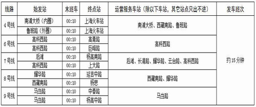 軌道交通4、6、7、8、9五條涉博線路在常規末班車后,將在世博園周邊站點加開加班列車,除重點涉博車站以外,其他途經車站只可下客出站,不可進站上客和換乘。加開列車末班車時間為0:10,運營間隔約為15分鐘一班。具體車站的首末班車時間還可查看各車站公告、至上海地鐵官網(/) 進行查詢或撥打地鐵服務熱線64370000進行詢問。