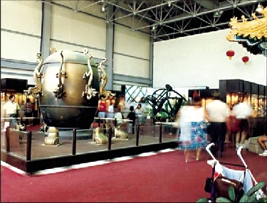 這三條線的所有展品,是被典型的中國皇家園林貫穿起來。展廳中央有一人工小湖,兩片池水由一羅鍋橋相隔。湖畔石筍、太湖石嶙峋,修竹郁郁蔥蔥。周圍是長廊、水榭,小橋旁有一個金碧輝煌的琉璃八角亭。