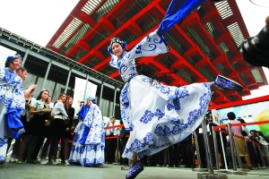 上午10時,隨著“北京歡迎你”歌聲的響起,北京周慶典廣場第一場文藝演出開始。白色的天壇是背景,舞臺上紅衣少女隨著鼓點在舞動,鼓點聲從廣場中心向四周傳開,傳向世博軸,傳向中國館。