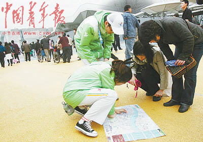 中國館南廣場上的30名首批志愿者都是來自復(fù)旦大學(xué)的學(xué)生。他們的工作在很多人看來很簡單,就是疏導(dǎo)游客,給游客指路。他們每天要重復(fù)幾萬次的回答就是:“對不起,預(yù)約券已經(jīng)發(fā)完了”,“您好,請往這邊走”……“現(xiàn)在我已經(jīng)不用看地圖就能清楚地給游客指路了。以前還不熟悉的時候,我利用休息的時間不斷地看地圖,已經(jīng)翻爛了兩份地圖,這是第三份了。”錢琲從包里翻開她的園區(qū)地圖,這一份也已經(jīng)快被她翻爛了,快斷裂的地方她用透明膠布粘著。