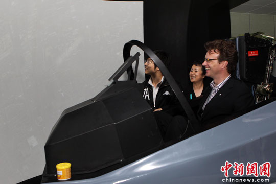 來到大型飛機模擬機展區,大山嫻熟地坐進駕駛艙體驗飛行。“那是浦東、這是陸家嘴。”他一邊操縱模擬機,一邊辨認著大屏幕上出現的地面標志性建筑物。大山對環形屏幕中顯示的上海非常熟悉,認出了很多地點,并笑稱要從世博會加拿大館上空飛過。走下駕駛艙,大山幽默地稱自己有點快學會開飛機了。