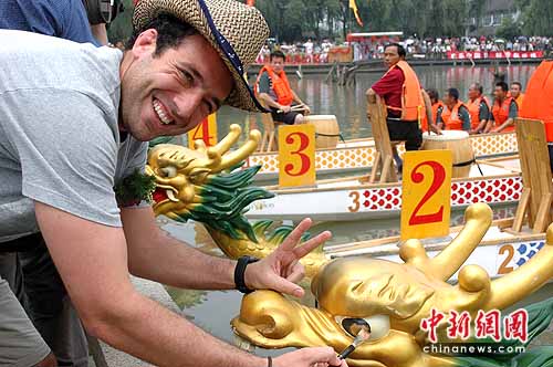 中新網蘇州6月15日電(趙龍)鑼鼓聲中,世博會智利館代表Tomas興奮地拿起手中的毛筆,對著龍眼點了一筆,整條龍舟頓時“活”了起來!船員們報以熱烈掌聲,Tomas激動地舉起雙臂:“加油!”