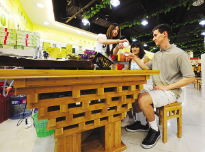 茶文化園內20個展臺前,均設有供賓客免費品茗、觀賞中華茶藝的休閑區,客人們在此休憩、品茗的同時,也被繽紛多彩、香味濃郁的各色中華名茶深深吸引,許多人往往會情不自禁地掏錢買幾份包裝考究、有世博會標識圖案的禮品茶饋贈給親友。比利時籍華人游客翁先生是食品采購商,他逐一品嘗了味道不一的帝芙特伯爵紅茶、薄荷茶、芙蓉茶、綠怡茶,對這些印有海寶和各國展館圖案的金字塔形茶葉包裝盒很感興趣,認為很有藝術感,要帶到比利時,讓大家品嘗一番中國佳茗,為此他一下子就訂購了3500份這種造型的禮品茶。據悉,光顧茶文化園的賓客中,近30%來自美國、加拿大、德國、新加坡、日本、韓國、尼泊爾等國家,世博茶文化園已成為外國賓客了解中國茶文化的一個窗口。(江躍中 顧武)
