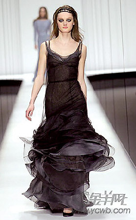 圓裙、小禮服是他的拿手好戲,Oliver最善于用他獨特的解構主義方式,刻畫出瘦瘦的袖子、緊身的褲裝、平直的肩線和蓬大的裙子。06秋冬的Rochas照例設計深沉,強調黑與灰,有些壓抑,卻又讓人上癮,欲罷不能。模特們長發披肩,戴著黑色的發箍,畫著煙熏眼妝,層疊的輕紗帶出一種游離感,活脫是黑暗王子筆下的精靈。