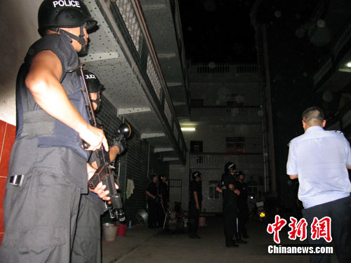 凌晨1時許,南寧市公安局局長廖洪濤與副局長吳宏飛率領(lǐng)數(shù)十輛滿載警察的車輛,飛速駛往橫縣。中新網(wǎng)記者跟隨這些全副武裝的特警和巡警等警種一同前往。