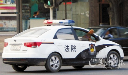 5月1日拍攝于四川綿陽街頭的一張照片,3日在騰訊微博上被熱議:一輛在大路上行駛的法院警車,副駕位置坐著一條寵物狗,狗的頭部伸出窗外,四處張望。網友調侃,這估計是警犬;也有網友說是導盲犬。3日晚9時,綿陽市中院給羊城晚報發來情況通報稱,涉事警車來自轄區的涪城區法院,法院給予民警記過處分。