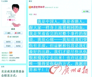 事件擾攘數天后,身在北京的成龍前晚終于打破緘默發出聲明,就自己的“詞不達意”,向全香港市民致歉。聲明內容大意是指美國助手把他的留言翻譯得不完整,自己只是不想香港與菲律賓民眾之間互相仇恨,更強調自己是百分百中國人,自己也認為必須追究菲律賓警方指揮不力的責任,更為遇難者感到悲痛,并向他們的家屬致上最深切的哀慟。