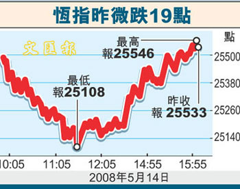 中新網(wǎng)5月15日電 據(jù)香港文匯報(bào)報(bào)道,港股14日早在缺乏利好消息、加上獲利盤涌現(xiàn)下,曾跌逾400點(diǎn),但在午后內(nèi)地股市彈升帶動下,跌幅顯著收窄。A股升近3%,令港股低位反彈400點(diǎn),恒指全日收報(bào)25533點(diǎn),只跌19點(diǎn),成交萎縮至682億元,是近3個(gè)月以來最低。