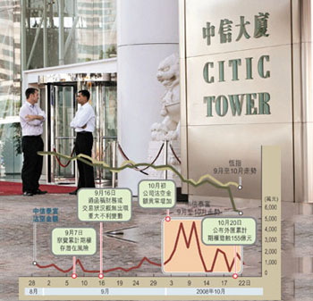 中信泰富股價(jià)繼21日急挫55%后,22日再挫逾24%。(圖片來源:文匯報(bào))