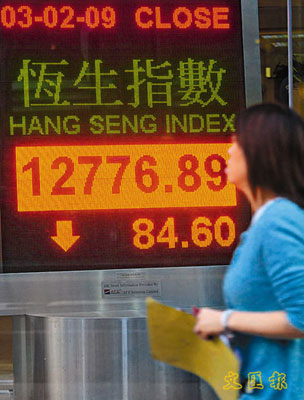 中新網(wǎng)2月4日電 據(jù)香港《文匯報》報道,港股3日再一次由升轉(zhuǎn)跌,早高開130點后,在高位反復徘徊,最高曾見13065點,但午市后升幅開始收窄,最多跌逾130點,全日收報12776.8點,跌84.6點,成交額進一步縮減至353.16億元。