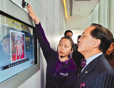 為推介香港館,煲呔(曾蔭權)不惜“粉墨登場”扮演粵劇大老倌?非也,原來香港館在入口處歡迎參觀者的是一個計算機造型游戲,曾蔭權親身上陣,一試游戲:“毋須粉墨也能裝一下大老倌,然后把趣怪扮相電郵給朋友。”
