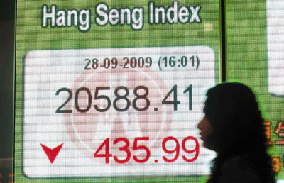 中新網9月29日電 據香港《文匯報》報道,期指結算日前,加上內地A股下午急跌,令恒指28日尾市跌幅擴大,全日最低位在3時半后出現,恒指曾跌近500點至20534點,一度失守50天線(即20573點)。恒指收報20588點,跌435.9點,跌幅逾2%,全日成交額再縮至511億元。