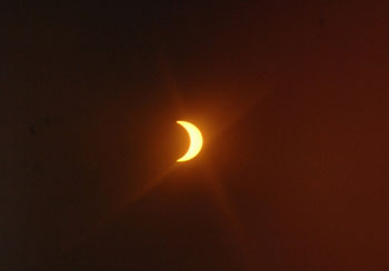 9時15分,四分之三個太陽被陰影遮蓋,之后就會慢慢復原,至10時半結束。