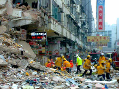 土瓜灣馬頭圍道一幢樓宇整幢倒塌,消防員架起云梯從旁邊大廈救出被困居民。消防員首先為居民綁上安全帶,然后逐個居民由云梯救落地面。