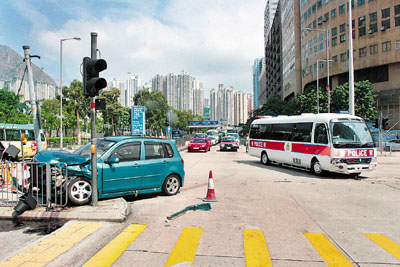 中新網10月12日電 據香港《文匯報》報道,香港九龍灣輔警總部門外發生警車被撞意外。一輛私家車11日中午途經宏照道,疑司機受道路工程影響,未留意不準右轉交通標志,將車右轉啟祥道,結果與一輛駛至警方中型巴士互撼,私家車撞車后在路上打轉再撼撞安全島燈柱,車頭嚴重損毀。