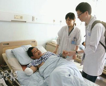 臥在病床上的賈大夫,破爛的腸臟已縫補(bǔ)好,情況穩(wěn)定過(guò)來(lái),但因雙臂和盆骨都折斷,動(dòng)也不能動(dòng),深切體會(huì)能醫(yī)不自醫(yī)的無(wú)奈。他坦言,若不是身受創(chuàng)傷,他應(yīng)是在災(zāi)場(chǎng)上救援的一員,但目前只能等待由香港到來(lái)的醫(yī)生為他動(dòng)手術(shù)!罢娴暮芨兄x香港醫(yī)生愿意前來(lái)幫忙……很有心……”