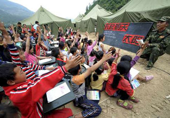 于是,災(zāi)區(qū)平地升起了帳篷放了桌椅、餐廳改建成課室、操場架起了活動板房,然后孩子就高高興興地上學(xué)去,努力地在這個非常時期爭取過一些正常的生活。莫說臨時學(xué)校環(huán)境差,那其實才是真正的“希望學(xué)校”,是孩子心靈的暫寄之處。