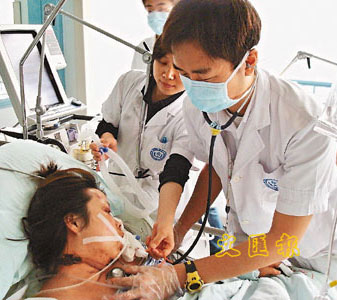 尹淑玲抵達醫(yī)院后,便協(xié)助病房內約百位骨折的病人,她把消毒藥水、紗布等放滿紅色背囊,懶理背囊與護士服不相襯,便扛著它穿梭病房,為病人清洗傷口,每天只睡4、5小時。“有個做了腳部截肢手術的30來歲的男病人,他背部也有一個大傷口,每次為他清洗傷口時,明知他很痛,但他很堅強,更感謝我們的幫忙。”