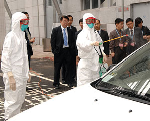 演習模擬兩地衛生部門的人員,在深圳灣口岸截查入境車輛時,發現有乘客出現發燒病征,懷疑感染禽流感。