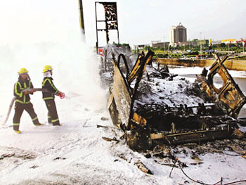 車禍發(fā)生后,私家車漏出電油,大巴上乘客紛紛逃命,其中一名大學(xué)生李啟文在睡夢中被撞擊巨響驚醒,他立即救出壓在座椅下的女友,然后將她抱離車廂狂奔300米。私家車隨即冒煙爆炸,旅巴也繼而燃起大火,被困在廢鐵中的陳姓私家車司機慘被活活燒成焦炭,而大巴上也有8人受傷,其中一名重傷男子被救出時已證實不治。