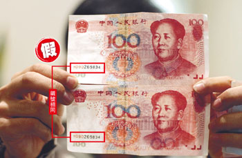 中新網1月9日電 據香港《明報》報道,內地近半年不斷發現“HD90”字頭百元面額人民幣偽鈔,有港人表示懷疑在香港找換店一次過換得8張同類偽鈔。