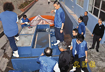 根據(jù)初步檢查結(jié)果,兩尾鱘魚(yú)不僅體內(nèi)有炎癥,體外也有不少擦掛傷口。專(zhuān)家會(huì)診后制定了“針療+藥物潑灑+水質(zhì)調(diào)整”三路并進(jìn)的治療方案,一方面按照每周兩次的頻率為鱘魚(yú)注射抗生素等針劑,同時(shí)每周向繁育池中潑灑2至3次調(diào)配好的粉狀藥物,主要功效都是消炎。基地最為緊張的水質(zhì)檢測(cè),則指派專(zhuān)人負(fù)責(zé)每日抽樣送檢。