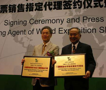 中新網3月3日電 據香港《大公報》報道,“中國2010年上海世博會門票銷售制定代理簽約儀式暨媒體見面會”2日下午在上海世博局舉行,此次簽約的13家銷售代理商,境內代理商4家,境外代理商9家。香港中國旅行社成為首批簽約的上海世博會門票境外指定代理商之一,香港中旅總經理周來衛接受了上海世博局授牌。