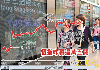 中新網4月30日電 據香港《文匯報》報道,市場憧憬國務院宣布將上海建設成國際金融中心及航運中心的細節,A股29日午市急升近3%,刺激香港中資股升幅擴大,令港股在豬流感陰霾下連跌2天后終見反彈,于29日期指結算日被挾高,以接近全日高位收市,收報14956.9點升401.8點,總成交508億元。