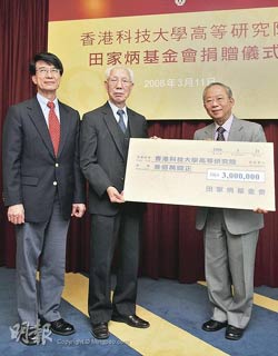 據香港媒體報道,田家炳基金會捐款300萬元給科大高研院,加上政府的配對基金,成立600萬元的“田家炳教育基金”;饡飨锛冶⒖拼笮6瓡飨愖鏉杉靶iL朱經武11日出席了捐贈鳴謝儀式。